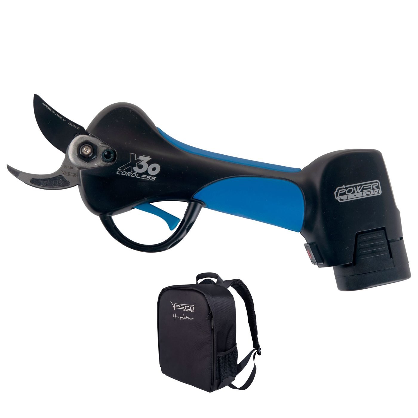 Compatibile con accessori professionali Vesco come X100, X100AF e XR14, la X30 può essere integrata in sistemi di potatura robotizzata e kit dedicati. L’intero set è contenuto in un pratico zainetto ergonomico, ideale per il trasporto e la gestione dell’attrezzatura.