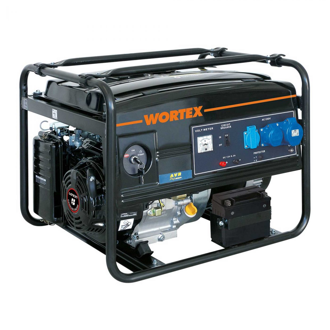 Gruppo elettrogeno monofase con motore a scoppio 4 tempi a benzina, flangiato ad un alternatore a 2 poli monofase con sistema di regolazione della tensione AVR. Avviamento con autoavvolgente ed elettrico a batteria.
